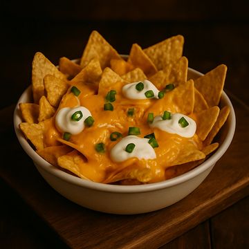 Crispy nacho chips smothered in molten cheese, topped with cool soured cream and fresh spring onion. A simple, sharable classic - the kind of snack the whole Family can agree on.