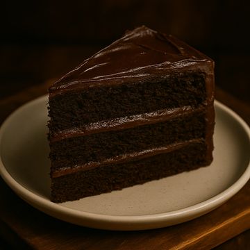 A rich, moist slice of indulgent chocolate fudge cake - smooth, deep, and unapologetically decadent.