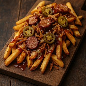 Enjoy our Bootleg Barrel BBQ-glazed fries, loaded with pork sausage, crispy onions, jalapeños, and cheese.