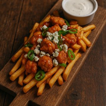 Crispy bootleg fries, layered with crispy chicken, bacon bits, and cheese, topped with Capone's White Smoke Ranch.